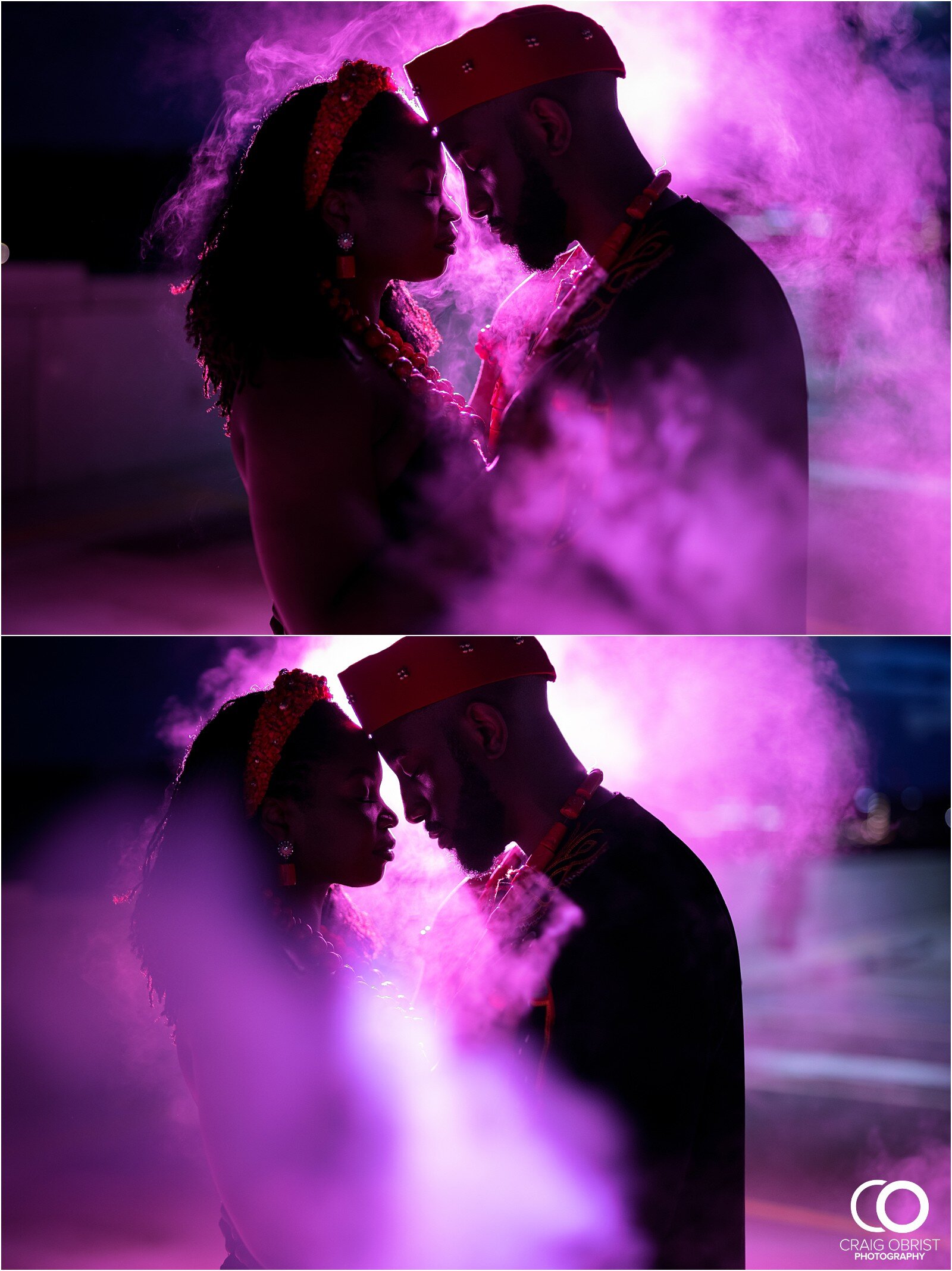 These days, we have been watching movies with our kids that are inspirational true stories on athletes that have overcome the impossible. I love seeing how it impacts our kids and even if it’s a little, I want them to see what “not quitting” looks like and that they can do the same thing or something even greater. With this post wedding shoot, we had to reschedule it twice because of rain… oy… weather can become a big headache in our business, but hey, what can I say? That’s just part of it. The third day that we rescheduled it to was still kinda “eh” with the weather. We couldn’t tell if it was going to be one of those summer afternoon showers or a downpour or what. The hourly forecast kept changing for the better and the chance of rain kept decreasing to only about 15%, so we went for it! Well, that 15% chance of rain became 100% as we were all driving to meet at the location. We got there and it rained cats and dogs. I was like, “OMG!!!! What are we going to do?” My mind was stressed out to the max. We felt awful that the call we made was not a good one and our beautiful couple was already dressed and ready to go. But, you know what? Adaugo + Allen never expressed that stress. They were the most calm and peaceful couple I’ve ever encountered. Allen kept saying, “It’s ok…” with a smile on his face! In that moment, I learned something… That it really is ok. There’s only so much you can control in life and sometimes, there’s NOTHING that you can control. We were so thankful that this happened with a couple who was so understanding and sweet. We kept looking at the radar and the forecast and felt that we should just wait a little bit. Because sometimes, waiting is a great thing… It looked like the rain may pass over us, but we took a chance and waited. While we waited, we just talked about life and that was my favorite part of the shoot. These two are so knowledgable and intelligent communicators, so wow… I learned A LOT in just those few minutes! If they ever become a teacher or a professor somewhere, I’m totally taking their class! So, here was the plan…. if the rain doesn’t stop, we decided that we would take at least one or two shots of them since they were already dressed (we were at a parking deck) and then reschedule another session for another day. But, guess what??? After 30 minutes, it stopped and the rain never came back! In fact, the rain made the temps a bit cooler and cloudy. Every photographer knows that cloudy is the most ideal weather condition for photos, so that in itself was great. But my gosh… the clouds looked amazing and then the most stunning rainbow I have ever seen in my life showed up! It was truly magnificent! Oh, I couldn’t help but say, “That’s God’s promise.” Oh, the supernatural feeling of peace came over me… Oh, what a little bit of patience and waiting can do! It was so worth the wait. What if we had just given up and left? What if we all just got frustrated and ruined the night in our hearts? What if we all blamed one another? Allen said how there were so many signs that night… YES! God was giving us divine signs left and right and that felt amazing… I felt like God’s grace was covering us and Adaugo + Allen’s marriage and that they were truly blessed. Ya’ll… it turned out to be one of the best nights we’ve ever had. Our couple as you can see were beyond gorgeous. People kept stopping and telling them “CONGRATULATIONS!” and complimenting how amazing they looked. We felt like we were escorting a king and a queen around the Avalon and that felt great! Every shot was “BOOM BABY!” They’re just so photogenic which made our job easy. We had so much fun throughout the whole shoot. It was such a hot night that we had to end it with some ice cream and cool down! We spent a short while just sitting there, talking about life again and enjoying our ice cream like little kids. I think Craig shared a little too much about his childhood, so I hope they still think we are “normal”. LOL! OMG! It was so so so fun! Adaugo + Allen, thank you for EVERYTHING! You guys have been the most ideal couple in so many ways. We are sincerely grateful for you… May God continue to give you signs and bless you in ways you can’t even imagine! I pray that you’ll never forget the rainbow from this shoot and that your faith will always be with Him in all things. Be blessed!
